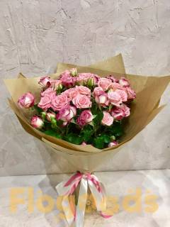 Пышный букет, декорированный зеленью. Хризантемы в сочетании с розами – это привлекательный и нежный подарок, он послужит идеальным вариантом для подарка родным и близким. Розово-белая цветная гамма отлично подойдет для любимой девушки.
